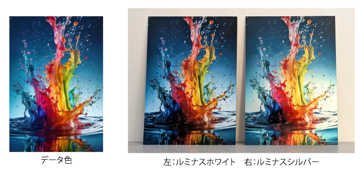 ルミナスシルバーを選択された場合、地色のアルミの銀色が透けて表現されます。このため、データ上の白色部分は銀色に、その他の色は全体的にメタリックで彩度が落ち着いた仕上がりとなります。